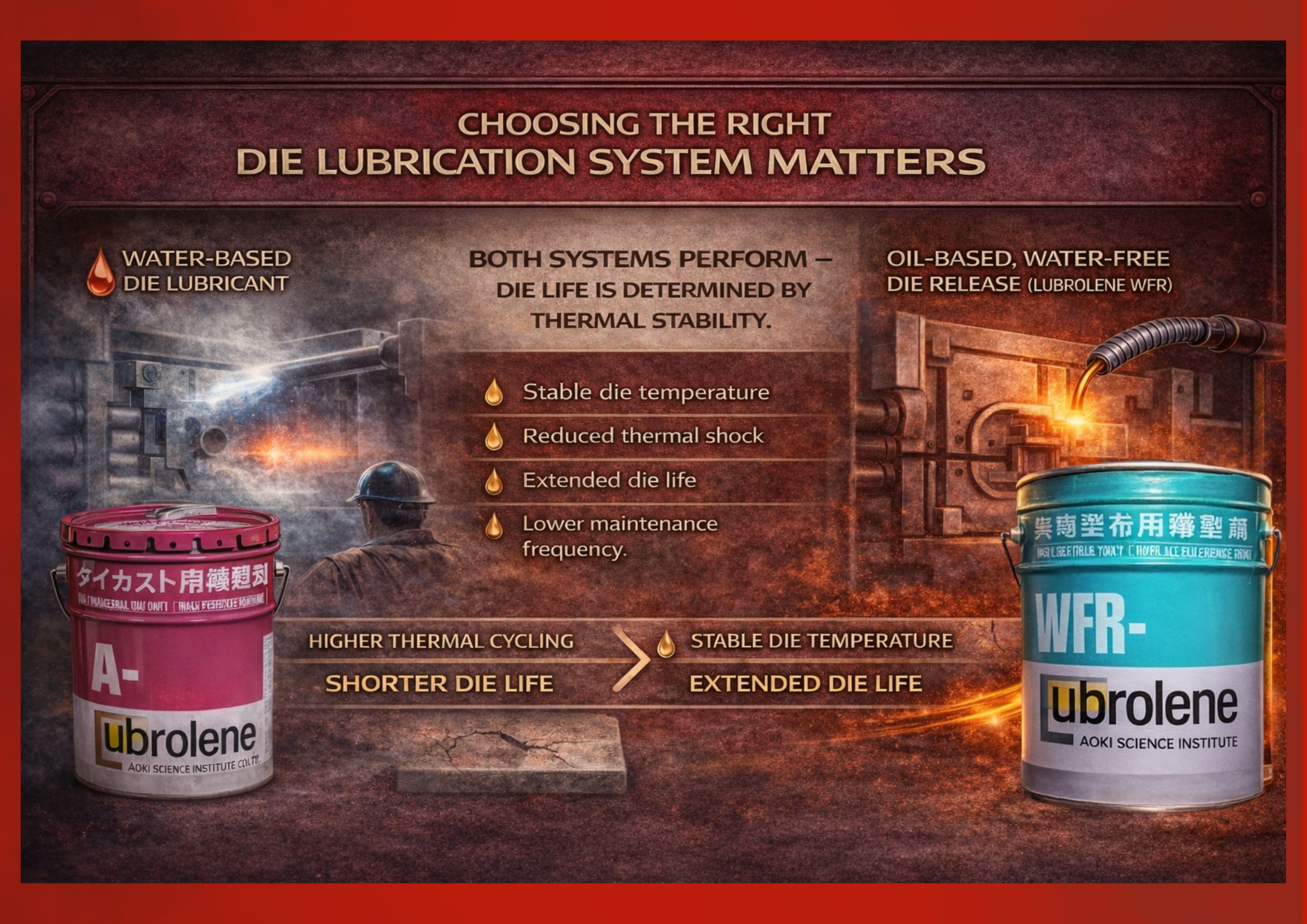 Water-based die lubes are widely used due to their cooling effect and ease of application. However, when sprayed onto dies operating at high temperatures, water evaporates instantly, creating rapid temperature fluctuations on the die surface.